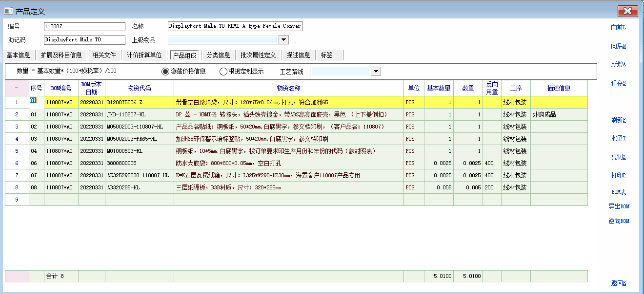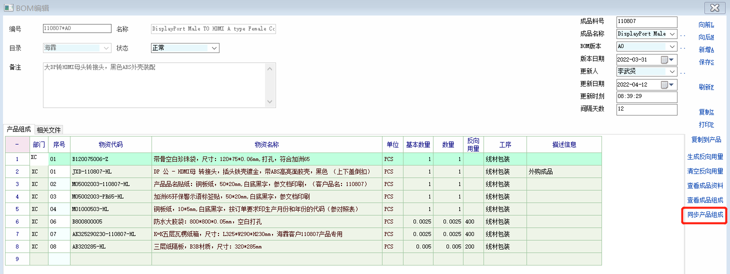 为提高工程人员维护更新BOM的效率,找十二老师定制了实现该功能的dll文件,后又请阿彪老师帮忙完善了实现该功能的脚本。 此脚本是建立在启用BOM的8个扩展属性的基础上(主物资料号保存在第一个扩展属性) 详情参考:BOM扩展属性使用分享 http://myoit.cn/topic_list_detail?subject_id=3&topic_id=102340&topic_page_id=2 在此感谢阿彪老师,十二老师的帮助! 1. 在BOM记录编辑脚本定义添加【同步产品组成】控件 int func_show_win() { if(have_role("0005")==1)//拥有角色权限编号0005(产品资料编辑和BOM编辑权限)的操作员才生成控件 { gui_create_speedbutton("Panel_Func","on9",0,387,80,22,"同步产品组成","call_prog.fzdcp_csp"); } 2. 新建脚本文件 fzdcp_csp int test() { return 1; }; int main() { int i; string sql,vql,m_resid,m_ver,bm_id,sqlattr,v_bombh,v_bomgxr,v_bomgxrq,v_bomgxsk,count_res; m_resid = gui_get_val("edit_Ext1");//获取BOM扩展属性1(主产品料号) bm_id = gui_get_val("Edit_Bom_Id");//获取BOM编号 sql = "select ext_2 from res_composing where res_id = '" + m_resid + "'";//获取产品资料已有产品组成的BOM编号(产品组成明细的自定义2) db_run(sql); m_ver = db_res(0); string tt; tt = "是否同步到:" + m_resid + " 的产品组成明细,版本号为:" + bm_id + " ?"; if (m_ver != "") {tt = "当前产品:" + m_resid + " 存在产品组成明细,版本号为:" + m_ver + " 是否继续同步?";} if (confirm(tt) == 1) { vql = "sub_res_id,num,waste_factor,note_info,order_id,base_num,emf_process_id,sub_attr_val_1,sub_attr_val_2,sub_attr_val_3,ext_1,ext_2,ext_3,ext_4,pcode"; sql = "delete from res_composing where res_id='" + m_resid + "'";//删除BOM对应的产品资料已有的产品组成明细 db_run(sql); sql = " insert into res_composing(res_id," + vql + ")"; sql = sql + " select '" + m_resid + "'," + vql + " from res_bom_item where bom_id='" + bm_id + "'";//更新当前BOM明细到对应的产品资料的产品组成明细 db_run_process(sql); sql = " select count(1) from res_composing where res_id='" + m_resid + "'"; db_run_query(sql); sqlattr = "select * from res_attrwhere res_id='" + m_resid + "' and attr_id in('bombh','bomgxr','bomgxrq','bomgxsk')";//获取产品资料的4个附加扩展属性 db_run_query(sqlattr); count_res = db_row_count();//获取产品资料的附加扩展属性记录数 if (count_res<4) { for (i = 0; i < 4 - count_res;i++) { db_add_row();//添加一行记录 } } for (i = 0; i < 4;i++) { db_go_row(i);//指向对应的记录 db_set_value_ext("res_id",m_resid);//附加扩展属性表名赋值 switch (i) { case 0: db_set_value_ext("attr_id","bombh");//附加属性ID赋值 db_set_value_ext("attr_val", bm_id);//附加属性bombh赋值 break; case 1: db_set_value_ext("attr_id", "bomgxr");//附加属性ID赋值 sql = gui_get_val("ext_Ext5");//获取BOM扩展属性5(BOM更新人) db_set_value_ext("attr_val", sql);//附加属性bomgxr赋值 break; case 2: db_set_value_ext("attr_id", "bomgxrq");//附加属性ID赋值 sql = gui_get_val("date_Ext6");//获取BOM扩展属性5(BOM更新日期) db_set_value_ext("attr_val", sql);//附加属性bomgxrq赋值 break; case 3: db_set_value_ext("attr_id", "bomgxsk");//附加属性ID赋值 sql = gui_get_val("edit_Ext7");//获取BOM扩展属性5(BOM更新时刻) db_set_value_ext("attr_val", sql);//附加属性bomgxsk赋值 break; } } db_select_area(2);//选择工作区2 sql = "delete from res_attr where res_id='" + m_resid + "' and attr_id in('bombh','bomgxr','bomgxrq','bomgxsk') ";//删除对应产品资料已有的4个附加扩展属性值 db_run(sql); db_select_area(1);//选择工作区1 db_set_table_name("res_attr");//设置表的名称 db_batch_insert();//更新产品资料的附加扩展属性值 if (db_row_count() > 0) { dbg('同步到 '+m_resid+' 的产品组成明细成功!') //view_app_obj("res", m_resid);//打开成品资料 } } return 1; }; |