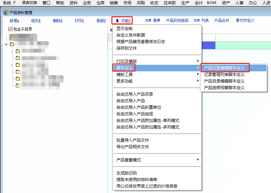 今天在QQ群有用户提出如何限定产品编号的长度,目前暂时用脚本可以达成该需求,以下脚本供参考,有更好的解决方法欢迎跟帖分享,谢谢! 1.打开【产品资料管理→功能→更多功能→相关字典定义】,新增字典标识:residcd,把需要【限定产品编码长度的目录编号】分别作为【字典编码】,把【字符长度】作为【字典名称】 2.打开【产品资料管理→功能→脚本定义→产品记录编辑脚本定义】,添加下列脚本【若为空,先初始化】 extern change_obj; int func_f9_call() { //msg('f9 pressed'); return 1; }; int func_show_win() { //msg('show win'); return 1; }; int func_create_rec() { //msg('create rec'); return 1; }; int func_edit_rec() { //msg('edit rec'); return 1; }; int func_delete_rec() { //msg('delete rec'); //can_delete=1; return 1; }; int func_save_rec() { //按目录限定编码长度,在产品字典添加自定义字典【residcd】,将【目录编码】作为【字典编码】,【字符长度】作为【字典名称】 string mlbh,residcd,resid; mlbh = gui_get_val("ComboBox_Ext_Res_Cat_Id") //获取产品目录编号 resid = gui_get_val("Edit_Res_Id") //获取产品编码 residcd = dt_get_name('residcd',mlbh) //获取自定义字典【residcd】对应字典编码的字典名称 if(strlen(resid) != residcd && residcd != '') //当当前产品编码字符不等于字典名称时,弹出警告,清空产品编码和助记码并拒绝保存 { warn('警告:本目录下的产品编码限定为【'+residcd+'】个字符,当前产品编码字符:【'+strlen(resid)+'】个,请重新输入产品编码!') gui_set_val("Edit_Res_Id",'') gui_set_val("Edit_Easy_Code",'') gui_focus("Edit_Res_Id") can_save=0; }; //msg('save rec'); //can_save=1; return 1; }; int func_after_save() { //msg('after save rec'); return 1; }; int func_after_delete() { //msg('after delete rec'); return 1; }; int obj_change() { //msg('obj change'); //change_obj return 1; }; int func_duplicate_rec() { //msg('duplicate rec'); return 1; }; string change_col,change_col_id,change_row_id; int bom_cell_change() { //msg('bom_cell_change'); return 1; }; 打开产品字典的路径 |
