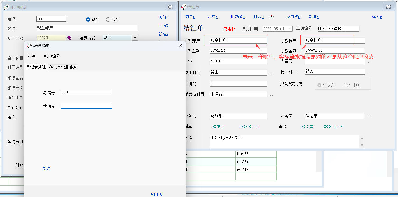 请老师修复一下,结汇单之前已审核单据在账户编号修改处理后付款账户/收款账户全部显示成000现金账户,但实际流水和报表结存又是对的,从之前选择的账户收支,没有从显示的这个现金账户收支;所以看原始单据容易误导,并在生成会计凭证时提示:“会计科目未定义- 转入户头的会计科目(sid.tag_account)”;