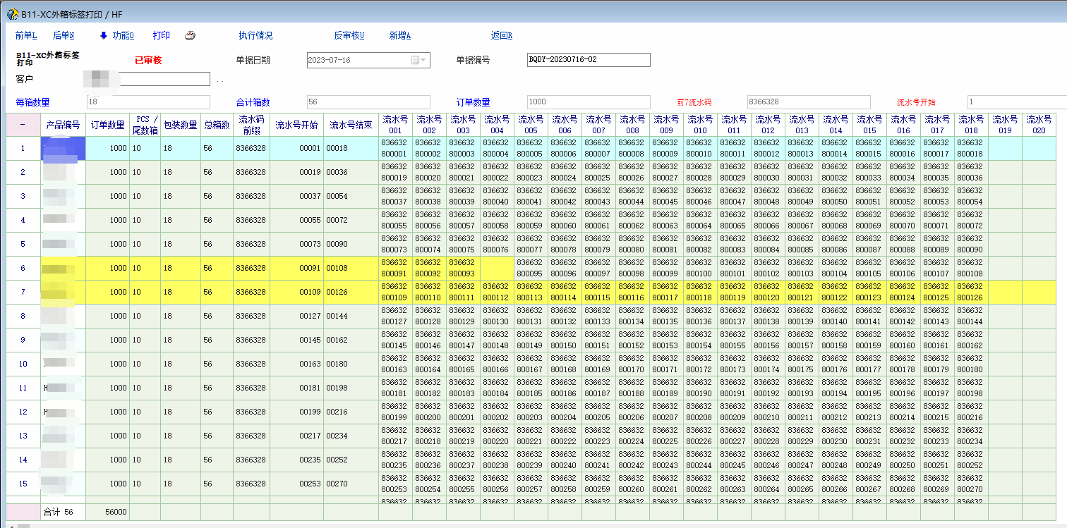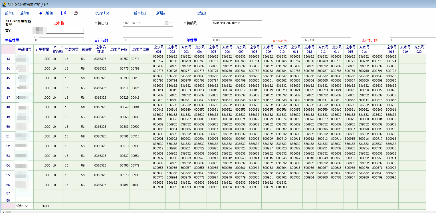 有客户的外箱流水码要求从条形码改为二维码,每个成品一个流水码(12位),前4位为固定的的供方代码,第5位为年份简码,6-7位为生产周,后5位为流水号,每张二维码标签最多包含100个流水码,不同PO同一时间出货的,流水码不能相同,目前只有每箱100PCS以下的订单,所以根据这些条件,启用了一个自定义单据来做外箱标签,用脚本来自动生成所有流水码 目前的脚本只限于每箱<=100PCS的包装数量,超过这个包装数量的脚本需要修改根据指定行复制行内容的条件 脚本思路: 1.启用一个单据类型【HF】的自定义单据,不影响库存,引用【BA】销售订单,表头只显示客户,启用5个表头扩展属性,用来记录【每箱数量,合计箱数,订单数量,前7位流水码,流水码开始】等数值 2.根据表头的客户来判断是否需要生成流水码(有其他客户只打印箱号,不需要流水码) 3.引用销售订单明细数据,销售订单明细有包含【产品编号,订单数量,每箱数量,总箱数,尾数箱数量】等数值 4.根据每箱一个外箱二维码标签的条件(每箱数量超过100就需要多张,暂不支持),每箱一行明细,依据总箱数复制第一行的数据到N行 5.引用过来数据复制行数据完成后保存单据,在保存单据的时候来生成所有流水码 6.添加3个明细扩展列:【lsm,lshks,lshjs】分别为:【流水码前缀(窗口输入,限定7位数),流水号开始(首行窗口输入,脚本行循环赋值),流水号结束(脚本行循环赋值)】 7.根据每张二维码标签最多包含100个流水码的条件,添加101个明细扩展列,命名:lsh+3位序号,从lsh001-lsh101【测试ok后,这些明细扩展列可以不用显示出来】 8.根据每箱数量结合第一个流水码先生成【流水码开始】,【流水码结束】,第一列【流水码】的数据 9.根据列循环开始的列号结合每箱数量来循环生成剩下的流水码数据 10.在打印模板用脚本生成二维码数据,每个流水码之间加上回车字符 单据脚本节选(部分): int func_show() { gui_hide("SpeedButton_Print") int xx,yy,ww,hh,; xx=gui_get_x("SpeedButton_Print") //【打印】横向坐标 yy=gui_get_y("SpeedButton_Print") //【打印】控件纵向坐标 ww=gui_get_w("SpeedButton_Print") //【打印】控件宽度 hh=gui_get_h("SpeedButton_Print") //【打印】控件高度 gui_create_speedbutton("ScrollBox_Func_Left","HF_print",xx,yy,ww,hh,"打印","call_csp.voucher.HF.HF_print"); gui_set_hint ("HF_print", '提示:按照客户匹配打印模板'); gui_set_font_color('HF_print',16711680); gui_set_font_color("HF_print",16711680); gui_disable("edit_Ext1") gui_disable("edit_Ext2") gui_disable("edit_Ext3") gui_disable("edit_Ext4") gui_disable("edit_Ext5") gui_set_font_color('edit_Ext1',16711680); gui_set_font_color("lab_Ext1",16711680); gui_set_font_color('edit_Ext2',16711680); gui_set_font_color("lab_Ext2",16711680); gui_set_font_color('edit_Ext3',16711680); gui_set_font_color("lab_Ext3",16711680); gui_set_font_color('edit_Ext4',0x0000ff); gui_set_font_color("lab_Ext4",0x0000ff); gui_set_font_color('edit_Ext5',0x0000ff); gui_set_font_color("lab_Ext5",0x0000ff); string m_kh; m_kh = gui_get_val("ComboBox_Ext_Eba_Id"); if(m_kh != 'A0004') { gui_hide("edit_Ext1") gui_hide("lab_Ext1") gui_hide("edit_Ext2") gui_hide("lab_Ext2") gui_hide("edit_Ext3") gui_hide("lab_Ext3") gui_hide("edit_Ext4") gui_hide("lab_Ext4") gui_hide("edit_Ext5") gui_hide("lab_Ext5") }; if(m_kh == 'A0004') { gui_show("edit_Ext1") gui_show("lab_Ext1") gui_show("edit_Ext2") gui_show("lab_Ext2") gui_show("edit_Ext3") gui_show("lab_Ext3") gui_show("edit_Ext4") gui_show("lab_Ext4") gui_show("edit_Ext5") gui_show("lab_Ext5") }; return 1; }; int 按箱数复制行() { int i,rc; string v_ddsl,v_lsm,v_item,v_id; rc = grid_get_v("MG_Item","vr_item_ext_4",1,);//获取首行【明细自定义4】列数据(总箱数) v_item = grid_get_v("MG_Item","vr_item_ext_4",2,);//获取第二行【明细自定义4】列数据(总箱数) v_ddsl = grid_get_v("MG_Item","inp_num",1);//获取首行【数量】列数据 v_lsm = grid_get_v("MG_Item","lsm",1); //获取首行【流水码前7位】列数据(弹窗输入) if(v_item == '') //当第二行为空时,根据【总箱数】补齐明细行数据(每箱一行数据打印一张二维码流水号标签) { for(i=1;i<rc;i++); { if(v_lsm != '') //当【流水码前7位】列数据不为空时根据第一行新增明细行数据,避免漏输入【流水码前7位】后还执行复制行操作 { grid_insert_before('MG_Item',i+1) //在指定行前插入一行记录 grid_copy_row("MG_Item",i,i+1);//复制行内容 grid_set_v('MG_Item','inp_num',i,v_ddsl); //最后一行有时其他列数据没有被复制成功,这里从第一行再赋值一次补齐数据避免尾数箱流水号生成失败 grid_set_v('MG_Item','vr_item_ext_4',i,rc);//最后一行有时其他列数据没有被复制成功,这里从第一行再赋值一次补齐数据避免尾数箱流水号生成失败 grid_set_v('MG_Item','lsm',i,v_lsm);//最后一行有时其他列数据没有被复制成功,这里从第一行再赋值一次补齐数据避免尾数箱流水号生成失败 }; }; }; //can_print=1; return 1; }; int 流水号生成() { //按流水号开始数值生成流水码 int i,rc,j,k,count; string v_mxsl,v_lsm,gwlsh,gwlshs,swlsh,swlshs,bwlsh,bwlshs,m_lshks,m_lshjs,v_zxs,v_ddsl,mmxsl,v_lshcsz,v_lshcszss; num v_mxsl,v_lshks,v_lshjs,v_lshkss,v_lshjss,v_mxsls,v_lshcsz,v_lshcszs,v_lshcszss,v_ddsl,v_lshjssh; //输入流水号开始数值 string m_kh; m_kh = gui_get_val("ComboBox_Ext_Eba_Id"); //获取客户编号 if(m_kh == 'A0004') //只有这个编号的客户需要外箱二维码流水贴纸 { inp_clear(); inp_para_set_title('请输入【流水号开始序号】') inp_def_string('mnum','流水号开始序号:'); inp_para() num inp_num; inp_num=inp_get_val('mnum') user_para_set("lsh",inp_num) if(inp_num == '') { msg('【流水号开