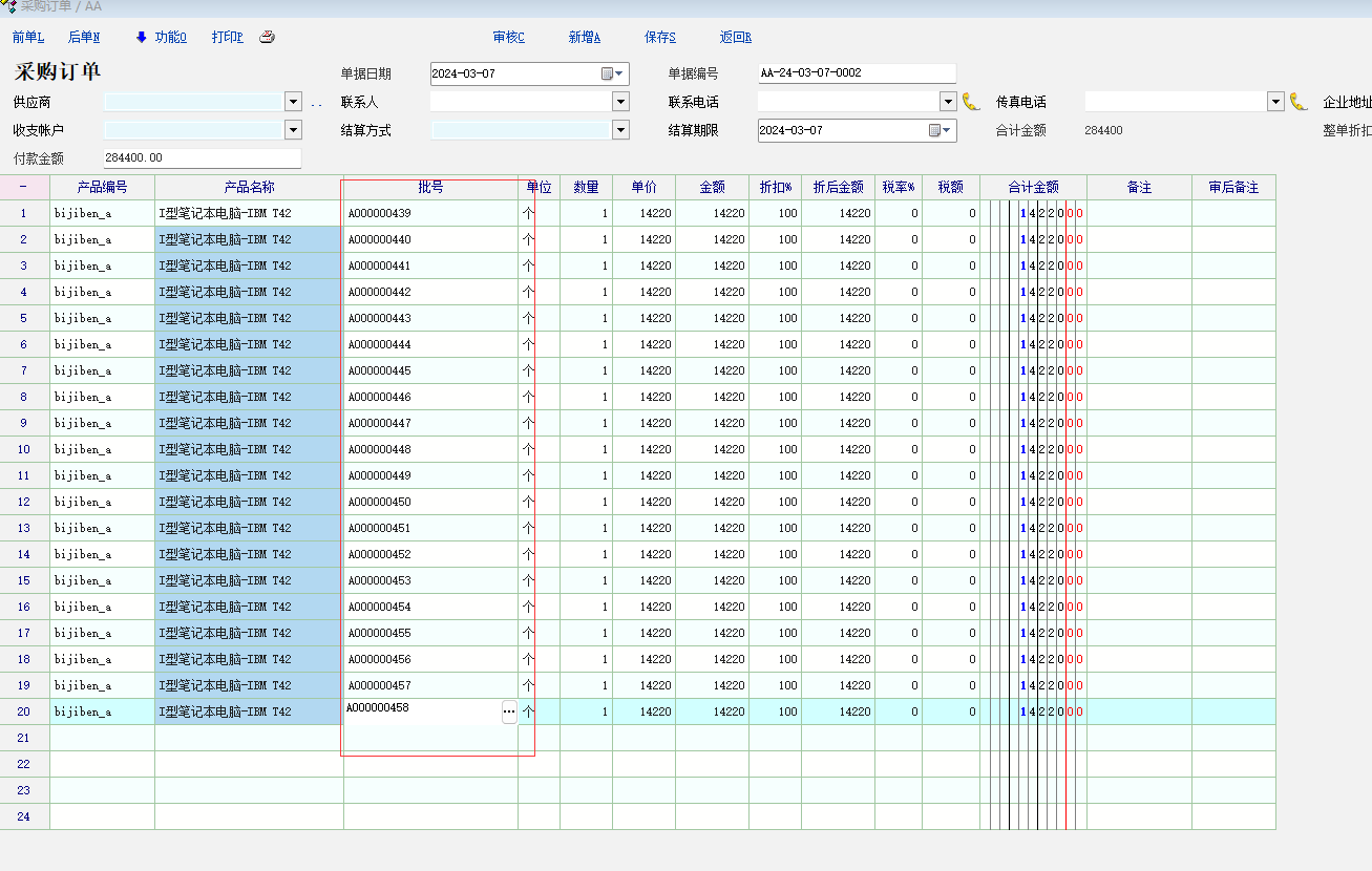 好像不行呢?比如我入库100个手机,每台手机都有个SN码这是机身唯一身份,怎么入库每个机子对应的SN码?一个单据里录100行?