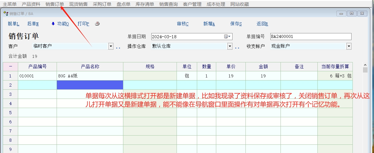 在横排模式下添加的单据:比如销售订单,入库单等,第一次打开的时候是新建单据,当录入产品--保存--关闭单据,再次从横排上面打开单据又是新建的单据,没有记忆功能(每次从横排模式上打开单据都是新建单据,不方便切换查看单据)。能否像导航里面一样打开一张有内容的单据,再次打开的时候还是张单据。