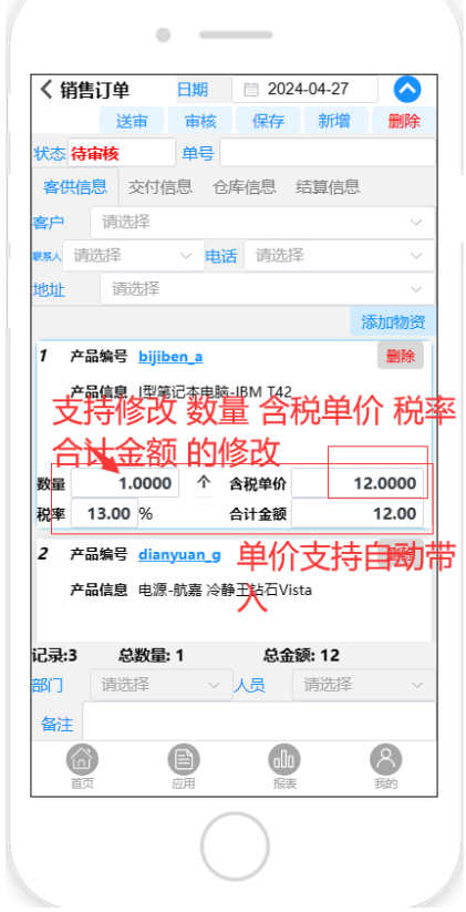 支持 修改数量 含税单价 税率 合计金额。