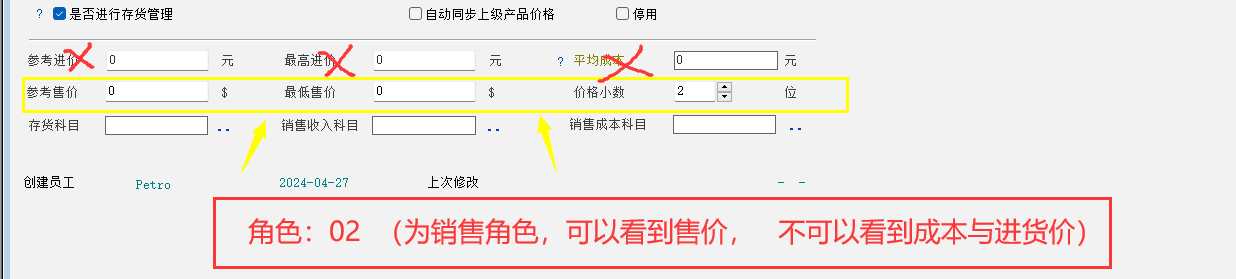 角色02:与01相反,视为销售部的员工,只能让此角色看到销售价格 , 不能看到 进价(最低/最高进价,成本)