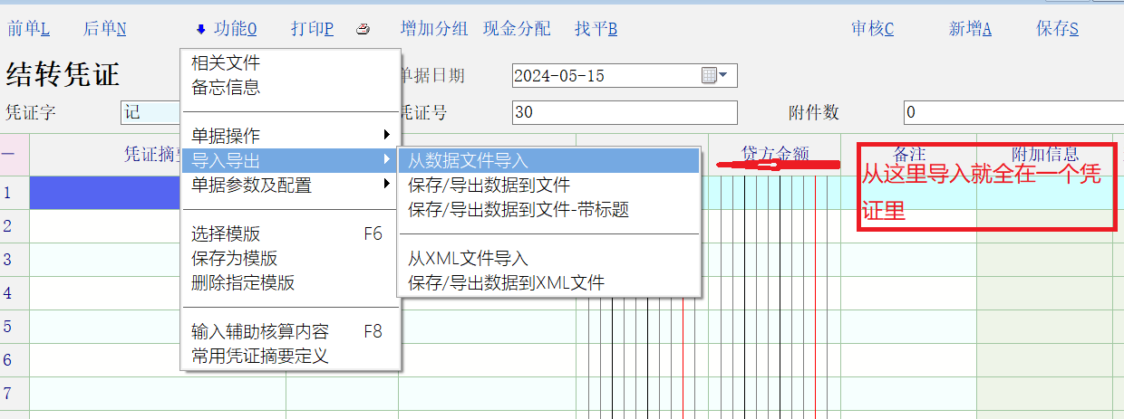 从这里只能全部导入当前凭证里