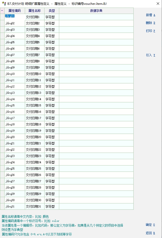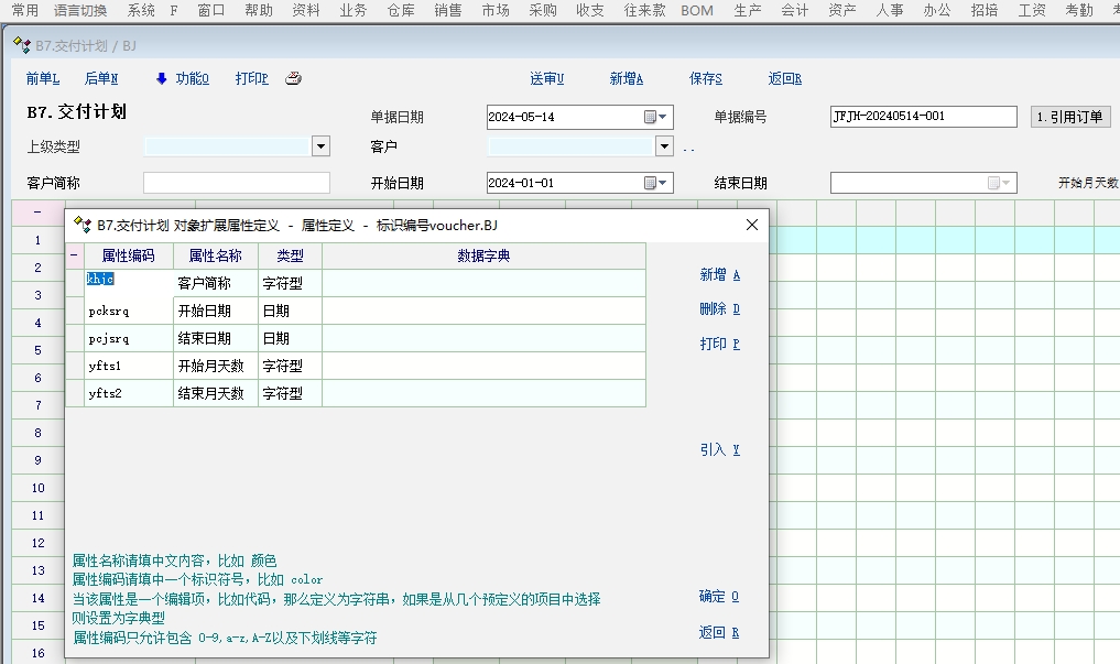 有客户需要把手工做的交货计划转移到系统里面录入,录入销售订单完成后,就开始根据实际生产计划做一个月的分批交货计划回传给客户,要求锁定星期天不可安排交货 提供给客户的解决方案思路: 1. 启用销售单据的自定义单据BJ改名:B7.交货记录(销售模块第7个启用的单据) 2. 增加5个表头附加扩展属性定义【khjc:客户简称】,【pcksrq:开始日期】,【pcjsrq:结束日期】,【yfts1:开始月天数】,【yfts2:结束月天数】 3. 增加31个单据明细附加扩展属性定义的交付日期列【jfrq01~jfrq31】 4. 新增一个不进行库存管理的产品资料【料号:原材料号,品名:品名】用来替代单据标题行 5. 显示方案把料号,品名,明细自定义列1-5,31个明细附加扩展列和备注列的标题名改为空 ,脚本定义录入开始日期回车后,自动添加这个产品到第一行 6. 默认开始日期为今年第一天20240101,脚本限定没有修改这个开始日期之前不能引用上级单据 BJ单据脚本 int init_test() { return 1; }; int create_voucher() { grid_mark_readonly('MG_Item','vr_item_ext_2') grid_mark_readonly('MG_Item','vr_item_ext_3') grid_mark_readonly('MG_Item','vr_item_ext_4') grid_mark_readonly('MG_Item','vr_item_ext_5') gui_set_val("date_pcksrq",'20240101'); //设置初始交付日期,以便限定此日期不能引用订单 return 1; }; int 锁定星期天的交付日期() { int i; string v_pcrq; for(i=1;i<=31;i++); //循环获取排产日期列 { v_pcrq = str_get_sub(grid_get_v("MG_Item",'jfrq'+fmt_int(i,"%02d"),1),0,8); //获取所有交付日期 grid_unmark_readonly('MG_Item','jfrq'+fmt_int(i,"%02d"),1) //解锁所有交付日期 if(get_week_id(v_pcrq) == '7') //当交付日期为星期天时,锁定该日期列 { grid_mark_readonly('MG_Item','jfrq'+fmt_int(i,"%02d"),1) } }; return 1; }; int func_show() { 锁定星期天的交付日期() gui_disable("edit_khjc"); gui_disable("date_pcjsrq"); gui_disable("edit_yfts1"); gui_disable("edit_yfts2"); gui_create_button("ScrollBox_Base","Switch_on13",925,7,75,22,"1.引用订单","call_csp.voucher.BJ.switchon13"); return 1; }; int cell_change() { int i,j; string v_jfrq; j = change_row_id; num ext1,ext2,ext3,ext5,v_pcsl,v_pcrq,inpnum,rq01,rq02,rq03,rq04,rq05,rq06,rq07,rq08,rq09,rq10,rq11,rq12,rq13,rq14,rq15; num rq16,rq17,rq18,rq19,rq20,rq21,rq22,rq23,rq24,rq25,rq26,rq27,rq28,rq29,rq30,rq31 for(i=1;i<=31;i++); { v_jfrq = 'jfrq'+fmt_int(i,"%02d") if(change_col == v_jfrq) { ext1 = vr_item_ext_1 ext2 = vr_item_ext_2 ext3 = vr_item_ext_3 ext5 = vr_item_ext_5 inpnum = inp_num rq01 = jfrq01; rq02 = jfrq02; rq03 = jfrq03; rq04 = jfrq04; rq05 = jfrq05; rq06 = jfrq06; rq07 = jfrq07; rq08 = jfrq08; rq09 = jfrq09; rq10 = jfrq10; rq11 = jfrq11; rq12 = jfrq12; rq13 = jfrq13; rq14 = jfrq14; rq15 = jfrq15; rq16 = jfrq16; rq17 = jfrq17; rq18 = jfrq18; rq19 = jfrq19; rq20 = jfrq20; rq21 = jfrq21; rq22 = jfrq22; rq23 = jfrq23; rq24 = jfrq24; rq25 = jfrq25; rq26 = jfrq26; rq27 = jfrq27; rq28 = jfrq28; rq29 = jfrq29; rq30 = jfrq30; rq31 = jfrq31; inp_num = rq01+rq02+rq03+rq04+rq05+rq06+rq07+rq08+rq09+rq10+rq11+rq12+rq13+rq14+rq15+rq16+rq17+rq18+rq19+rq20+rq21+rq22+rq23+rq24+rq25+rq26+rq27+rq28+rq29+rq30+rq31 vr_item_ext_4 = rq01+rq02+rq03+rq04+rq05+rq06+rq07+rq08+rq09+rq10+rq11+rq12+rq13+rq14+rq15+rq16+rq17+rq18+rq19+rq20+rq21+rq22+rq23+rq24+rq25+rq26+rq27+rq28+rq29+rq30+rq31 vr_item_ext_5 = ext2 - ext3 - inp_num if(ext2 - ext3 - inp_num < '0') { v_pcrq = grid_get_v('MG_Item',v_jfrq,1) v_pcsl = grid_get_v('MG_Item',v_jfrq,j) msg('第【'+j+'】行,交付日期【'+v_pcrq+'】输入的交付数量【'+v_pcsl+'】超过待交付数:【'+ext5+'】,请重新输入交付数量!') return 0; } } }; //change_col,change_col_id,change_row_id return 1; }; int 生成交付日期() //按照开始日期生成最近1个月的所有日期到明细第一行 { string m_ksrq,m_jsrq,m_ny1,m_ny2,m_ny,m_yf1,m_yf2,m_rq1,m_rq2,m_yfts1,m_yfts2,m_jsrq,m_jhts1,m_jhts2,m_jsrq1,m_jsrq2,v_jfrq,v_jfrq1,v_jfrq2,v_jfrq3; num m_ny1,m_yf1,m_rq1,m_yfts1,m_yfts2,m_ksrq,m_ksrq1,m_jhts1,m_jhts2,m_yfts1,m_yfts2; m_ksrq = gui_get_val("date_pcksrq") //获取开始日期 m_ny1 = str_get_sub(m_ksrq,0,6); //获取开始年月 m_ny2 = month_add(m_ny1,'1'); //获取结束年月(开始年月的下月) m_yf1 = str_get_sub(m_ksrq,4,2); //获取开始月份 m_yf2 = str_get_sub(m_ny2,4,2); //获取结束月份 m_rq1 = str_get_sub(m_ksrq,6,2); //获取开始日期 m_jsrq = fmt_int(m_rq1-1,"%02d") //获取结束日期 m_yfts1 = get_month_days(m_yf1) //获取开始月份天数 m_jhts1 = m_yfts1 - m_rq1 + 1 //获取开始月份实际天数 gui_set_val("edit_yfts1",m_jhts1); //赋值开始月天数 if(m_rq1 == '01') //当开始月日期为1号的时候,结束日期为当月最后一天 { m_jsrq1 = str_get_sub(m_ksrq,0,6)+get_month_days(m_yf1) //获取结束日期(开始年月+当月天数 gui_set_val("date_pcjsrq",m_jsrq1); //赋值结束日期 gui_set_val("edit_yfts2",'0'); //赋值结束月天数 }if(m_rq1 != '01'){ //当开始日期不是1号的时候,结束日期为开始月的次月(开始月日期-1天) m_jsrq2 = str_get_sub(m_ny2,0,6)+m_jsrq //获取结束日期(结束年月+结束日期) gui_set_val("date_pcjsrq",m_jsrq2); //赋值结束日期 m_yfts2 = get_day_between(m_ny2+'01',m_jsrq2)+1 //获取结束月份天数(结束月份1号到结束日期的天数差+1) gui_set_val("edit_yfts2",m_yfts2); //赋值结束月的实际天数 } int i,k,j,m_jhts1,m_jhts2; for(j=1;j<=31;j++); //排产日期赋值前先清空已赋值的内容,以便修改开始日期的时候实时更新最新的排产日期 { grid_set_v("MG_Item",'jfrq'+fmt_int(j,"%02d"),1,'') //清空第一行的31列排产日期 }; m_yfts1 = gui_get_val("edit_yfts1") //获取开始月的实际天数 m_yfts2 = gui_get_val("edit_yfts2") //获取结束月的实际天数 for(k=1;k<=m_yfts1;k++); //开始月的排产日期列循环赋值 { k = fmt_int(k,"%02d") //开始月的实际天数补足2位数