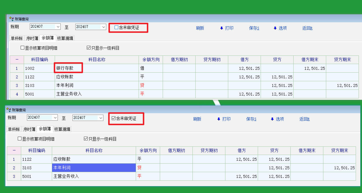 为什么不勾选【含未审凭证】,银行存款科目有显示。