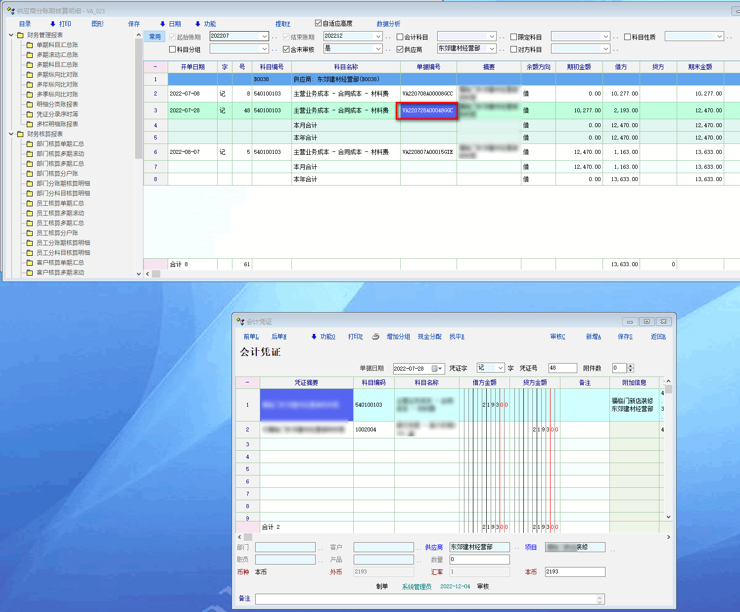 如果在账簿查询里面,找到并把该凭证反审核,重新保存一次,在报表里可以看到单据编号自动变更为 “VA220728A00048GGC”,此时双击可以正常打开对应凭证。