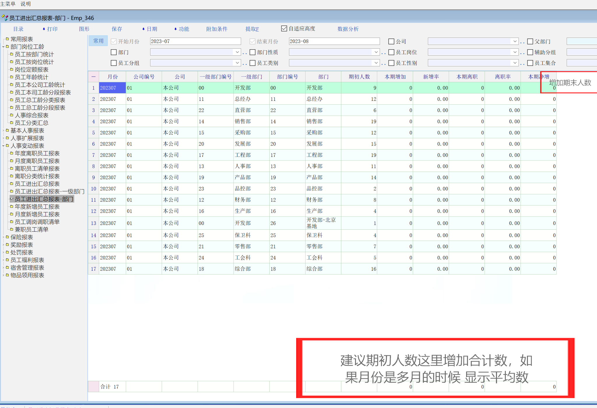 二级部门员工进出情况不能体现,建议按照常用报表中的  员工按部门样式进行优化  这样二级部门和一级部门的员工进出就会一目了然!谢谢