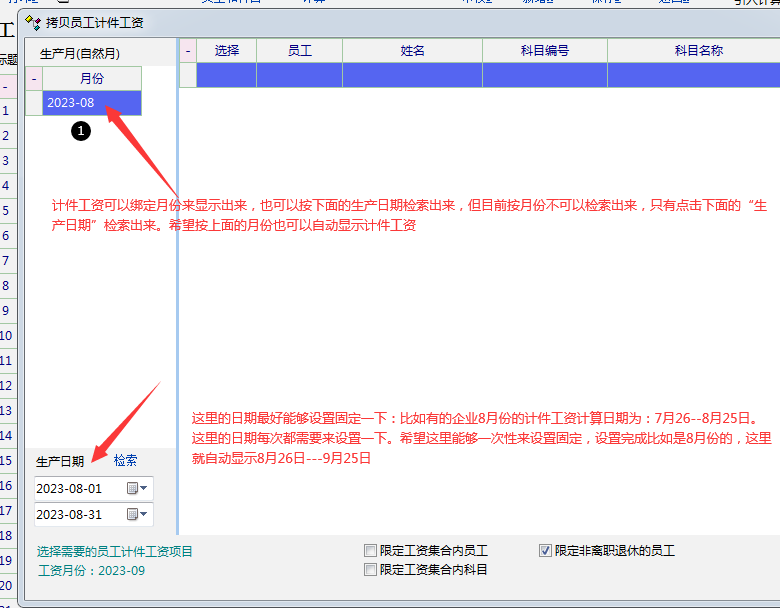 2,有的企业计件工资的生产月份与计算计件工资月份不是按标准的时间段来计算的,系统不可以设置固定的时间段---比如7月26日----8月25日,这个时间段按8月份的计件工资来计算。
