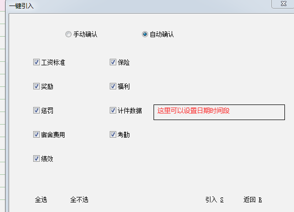 3,自动引入界面,计件工资打勾这里最好能够可以设置生产日期的设置:当月几号(上月几号)至本月几号(或者下月几号)可以选择固定