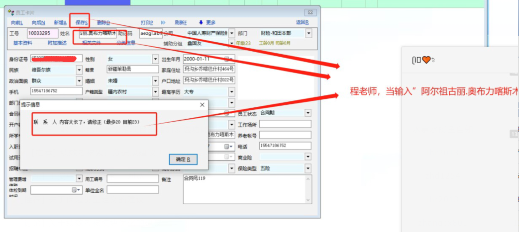 员工资料---卡片里面姓名--联系人等字段再添加一些字符,涉及维吾尔族的姓名,字段不够长