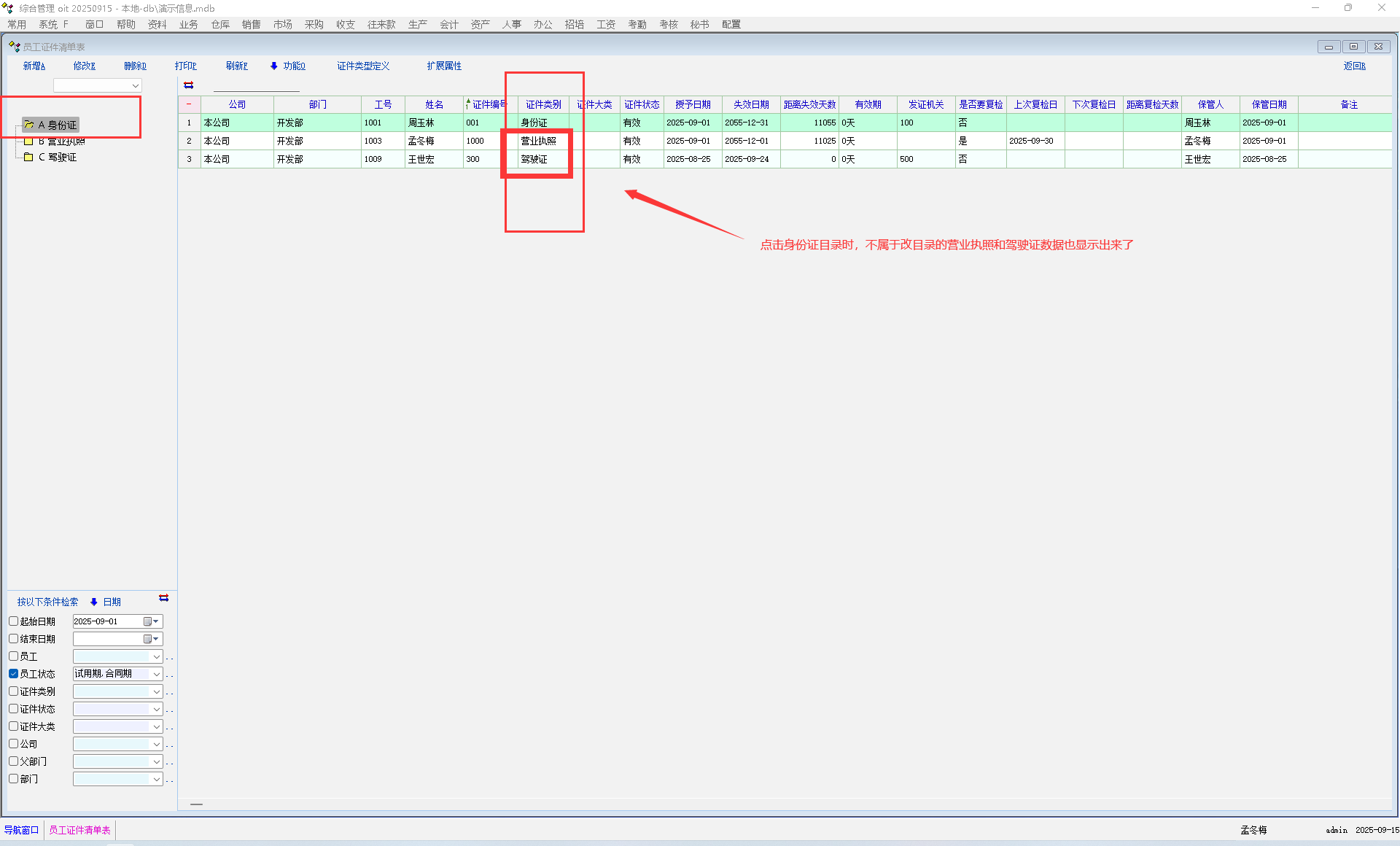 员工证件管理点击目录不能筛选改目录下的数据显示
