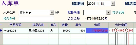 在进销存中,如果入库录入时,单笔入库金额超过二千万时,会以负数显示,如果只输入数量和金额不能反算单价,请问如何解决以上问题,谢谢!!!