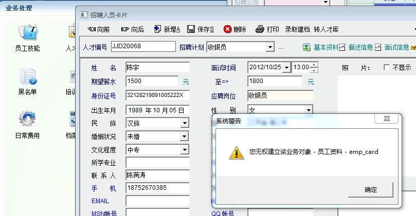 主要是将《员工资料》增删改综合编辑的权限,授予的话操作员就能删除员工资料记录,《删除记录》的权限就没有用。而《应聘人员》登记卡在将《员工资料》增删改综合编辑的权限回收时,就不能录取建档。