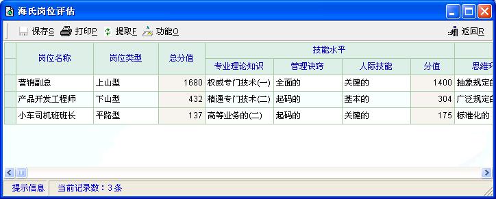 软件使用过程中有一点点建议,是使用中的。在实际操作中,打分是一个比较重要的环节,也是比较难的环节,因为要以对各岗位的仔细分析中才能真正把结果做到最好。所以说一是对各岗位要比较了解,二是对评价的各因素要比较了解,特别是各因素各级之间的区别要把握好,否则做出来的可能会一样,或者说各部门内部之间的差别不太大,这样效果不太明显,不能有效合理的区分各岗位,不能做到评估的目的。所以在使用软件过程中最好能把各因素的简单说明能显示出来,否则像专业理论知识中基本的(一)和基本的(二)有什么区别,大家在确定时怎么确定是一还是二?粗略使用,个人之言,呵呵。如果没说清楚再举例说一下,人际技能中,三项基本的,重要的,关键的应该如何解释,在系统中应该有提示。或者说应该对各因素等级有一个定义说明。
