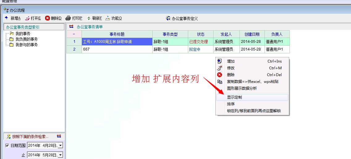 6,检索条件增加 -事务标题,扩展属性支持。特别是扩展属性比如 请假 ,扩展一个员工属性,当要查找到所有这个员工事务时就很难办了。