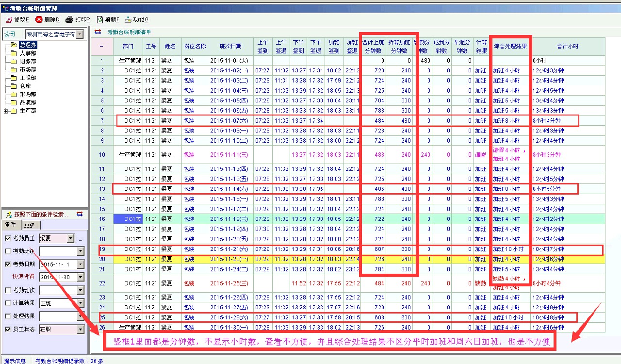 建议在考勤日帐里计算结果显示为小时,同时区分平时加班和周六日加班小时数(或者可以自定义计算结果)