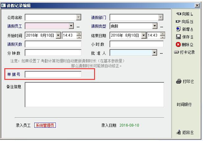 现在考勤管理中的如请假记录中的【单据号】只能填入20位的数字,