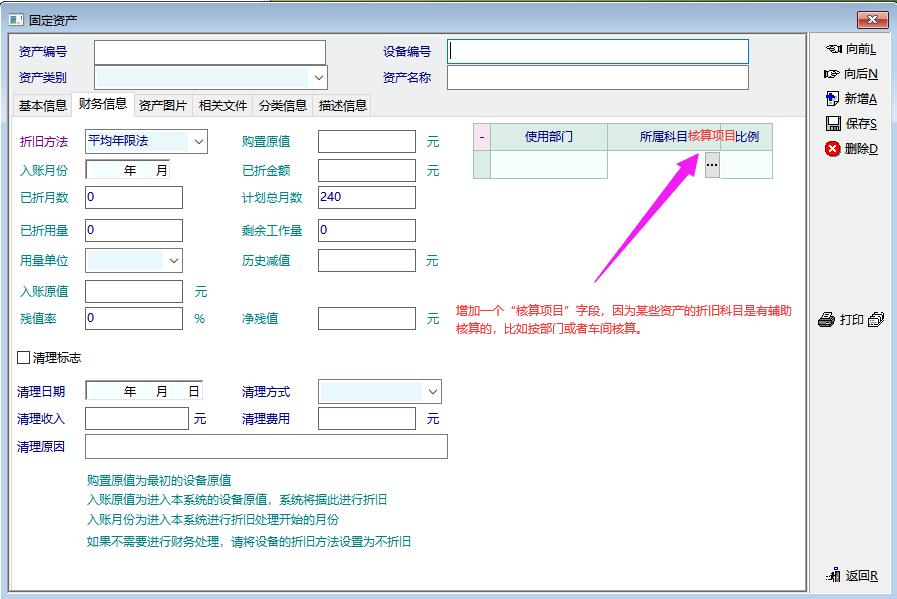 另外,建议在资产卡片的“财务信息”里的费用分配里增加使用部门相关的折旧科目核算项目信息,以适应某些折旧科目按照部门或者车间进行辅助核算的需要。