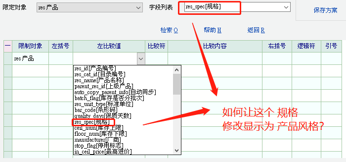 2、在自定义条件数据的界面里  字段列表及左比较值里的 res_spec 还是显示为规格