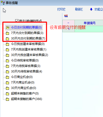 对于超期的单据一般都是需要优先关注处理的,但对于超过交付日期但是没能按期交付(完成)的单据,系统没有任何提示。建议增加对超期交付单据日期的提醒,可以单独列出,也可以包含到今日交付到期的单据中。