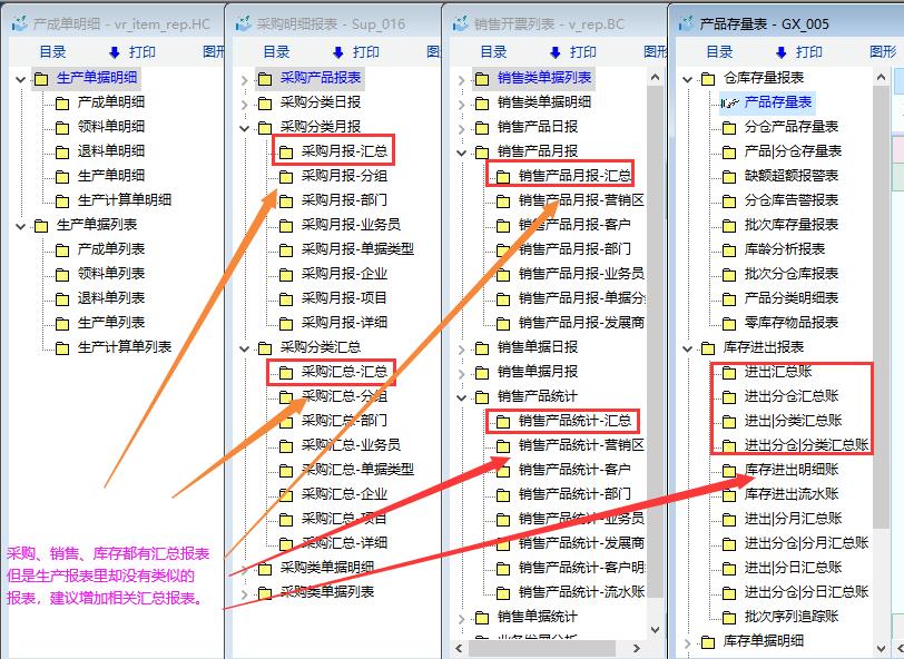 目前进销存报表中,采购、销售、库存报表中都有相关汇总报表,但是生产报表里只有单据明细和单据列表,缺少相关汇总报表,在实务中会造成不便,建议增加相关的汇总报表。