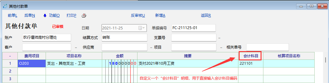 目前的收支单据,以“其他付款单”为例,引入凭证时是以收支科目对应的会计科目来生成的,这样就需要在收支科目里增加非常多的项目,比如“招待费”项目,有时需要计入“管理费用”,有时需要计入“销售费用”,是根据费用的实际用途来确定的,这样就需要新增两个“招待费”收支科目,分别对应不同的会计科目。目前的想法是在单据的“参数配置--单据明细附加扩展属性定义”里自定义一个“会计科目”明细,直接输入相关的会计科目代码,这样就可以避免上述情况,尽可能减少收支科目的设置数量。但是在凭证模板中如何获取新增的明细值,一直没有找到合适的办法,在单据传入的参数中找不到,脚本又不知道如何获取,希望老师和朋友们帮忙。大家如果有更方便快捷的办法也欢迎指导!