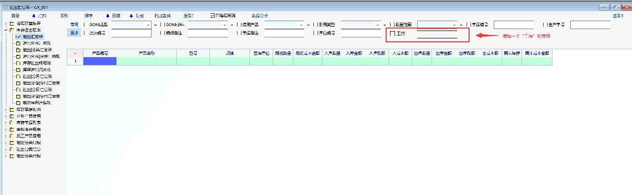 系统“领料单”可以显示工序,但是在库存报表中没有“工序”检索项,如果要查询某一时段某个工序领料的汇总,目前只有通过生产报表的领料单明细表导出通过excel筛选汇总,非常麻烦。如果在库存汇总报表中增加“工序”检索项就方便多了。