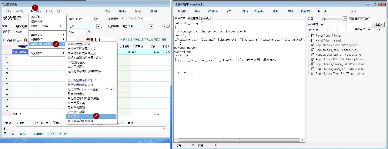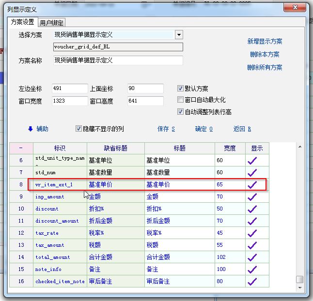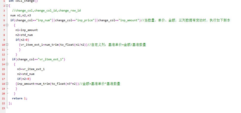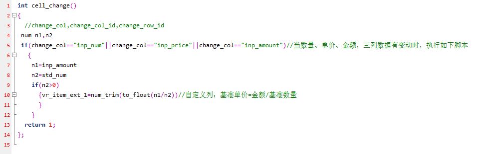 根据手工输入的基准单价,反算金额和单价 更改脚本: int cell_change() { //change_col,change_col_id,change_row_id num n1,n2,n3 if(change_col=="inp_num"||change_col=="inp_price"||change_col=="inp_amount")//当数量、单价、金额,三列数据有变动时,执行如下脚本 { n1=inp_amount n2=std_num if(n2>0) {vr_item_ext_1=num_trim(to_float(n1/n2))//自定义列:基准单价=金额/基准数量 } } if(change_col=="vr_item_ext_1") { n3=vr_item_ext_1 n2=std_num if(n2>0) {inp_amount=num_trim(to_float(n3*n2))//金额=基准单价*基准数量 } } return 1; }; |