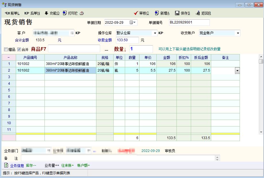 我有上线过副食品批发的客户,他们的需求,跟你的很相似。也是整件和零散一起拿货的。 我的解决方案是: 1、只用折算单位,不启用辅助单位。 2、所有产品的基准单位定义为最小单位。 3、在产品资料的规格处填写整箱的规格:如 25瓶/箱。 4、如同一产品同一次发货既有整箱数,也有散数,则在系统录入两行数据,分别记录不同单位的数量和单价。 5、开单的时候针对不同的客户用F8查询历史价格录入,非常高效。 这个方案的好处是,整箱价格和散件的价格可以独立分开处理。因为在实际应用中,不同客户的价格可能是不同的;整箱发货比散件发货优惠。还有一种是类似买3送一的情况,即买3箱,送一瓶,分开两行录入的话,瓶的价格就可以改为0,作为赠品。 |