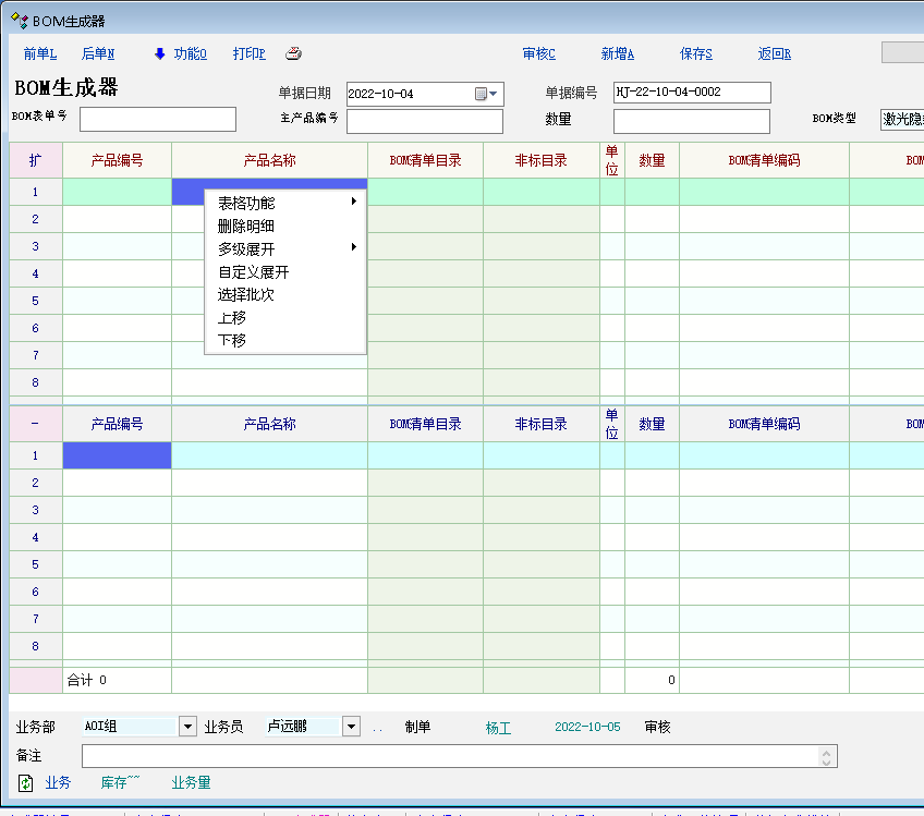 如下图, 主表格右键菜单, 比明细表格右键菜单少了 清空所有明细