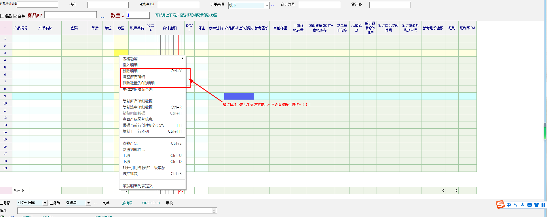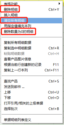 或者把顺序调整一下,删除明细、删除数量为0的明细、清空所有明细 这三个放在一起,很容易混淆操作。可以把这三个删除,隔开一下。 |