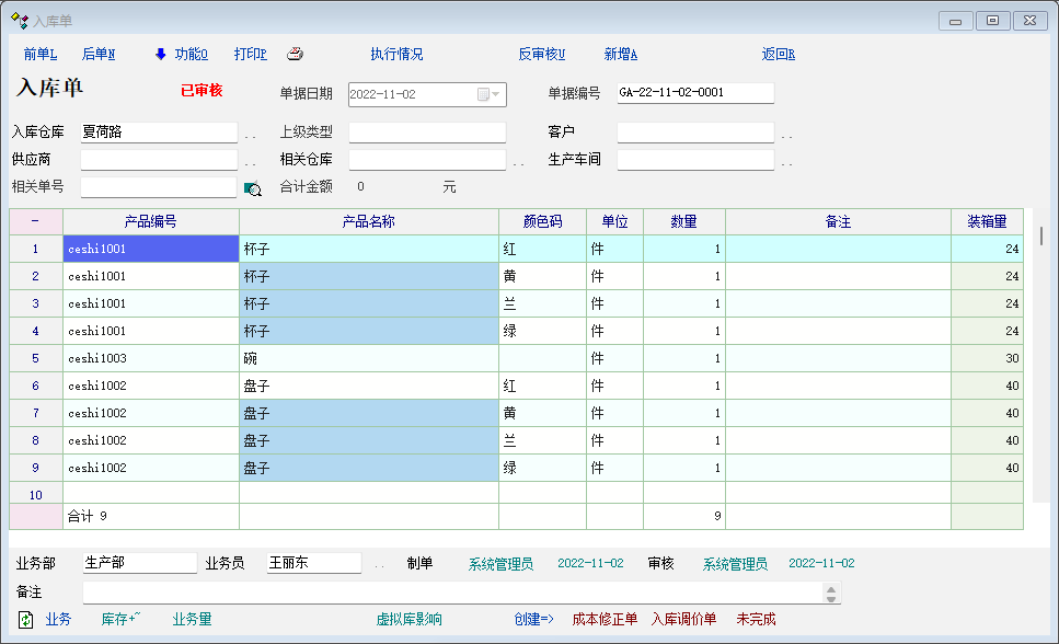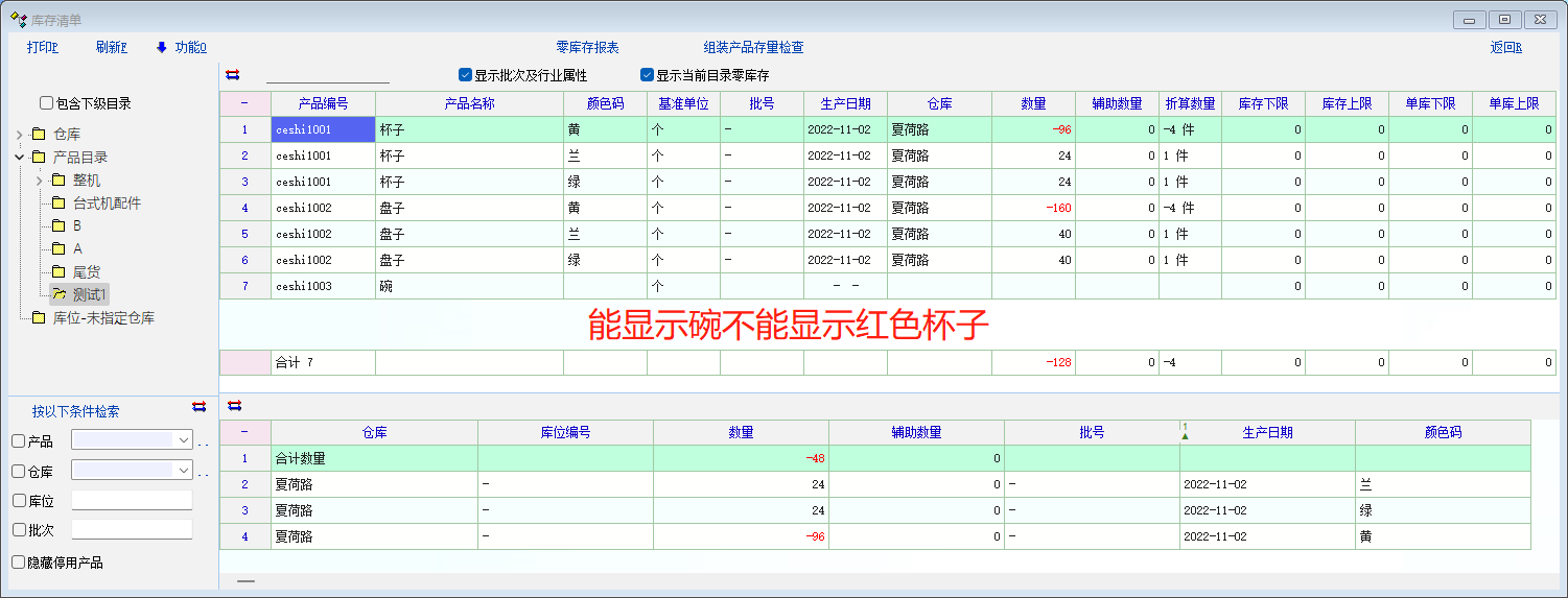 2、库存清单,选中显示当前目录零库存,显示库存为正、负的产品、显示库存为0的碗,不显示库存为0的红色杯子