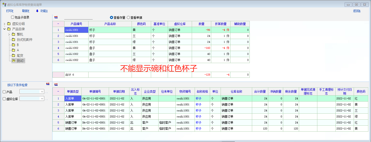 1、虚拟库存清单,显示库存为正、负的产品,不显示库存为0的产品(红色杯子和碗)