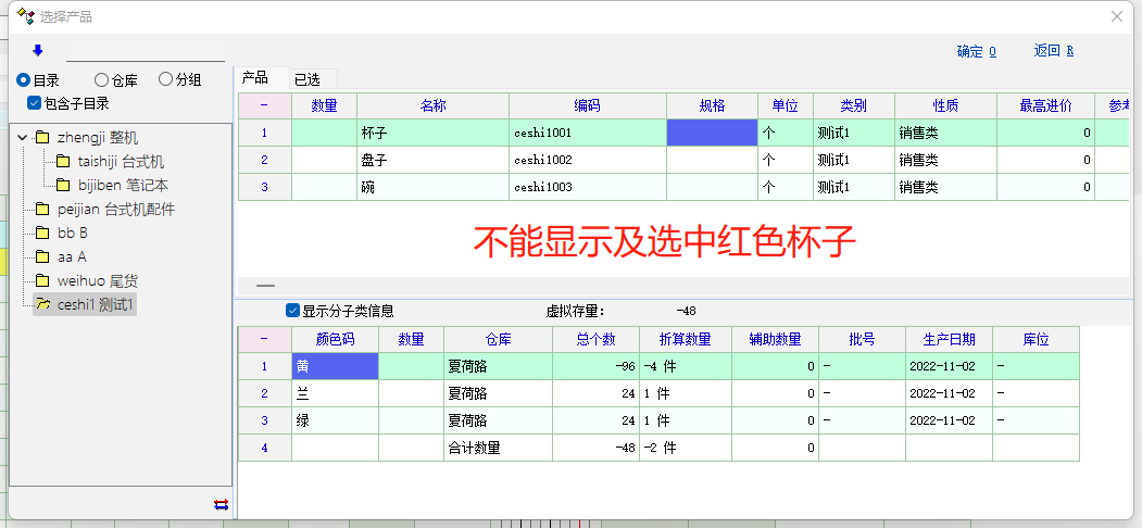 二、当再次创建销售发货及现货销售单,能显示并选中库存为0的碗,不能显示有颜色、库存为0的红色杯子