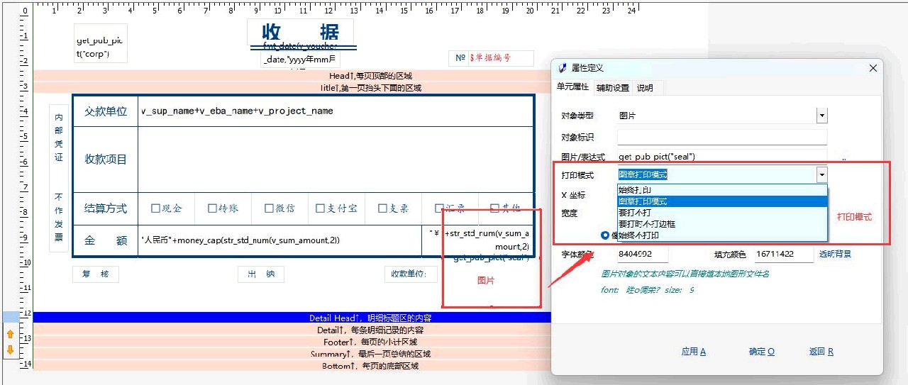 我的建议是在打印菜单中不再设置“有图片时按图形模式打印”,仅在图片属性中进行设置,如果图片的属性设置为“图章打印模式”,则仅对该图片生效,打印时其他内容都按正常模式打印。设置为图章打印模式后,该部分内容不会遮挡有重叠的其他内容。