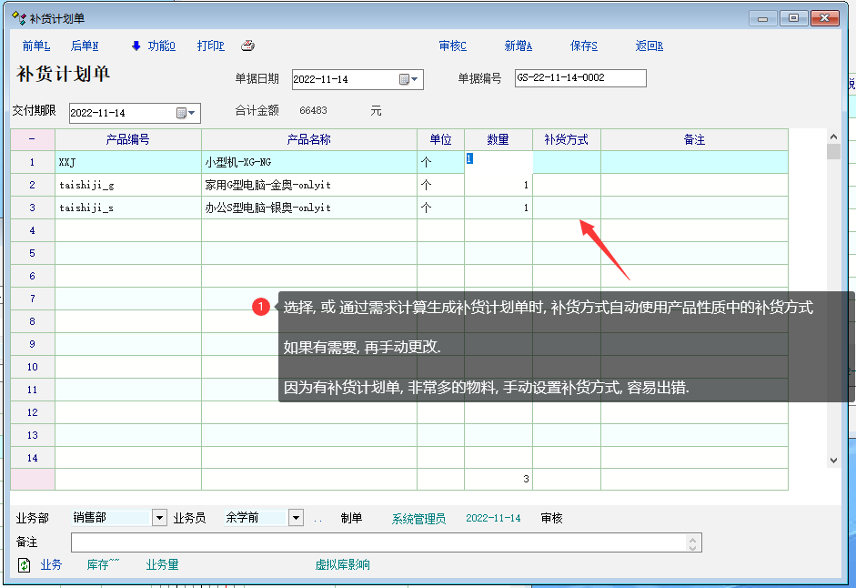 3. 通过需求计算生成补货计划单时, 自动选择产品性质中的补货方式, 如果有需要再手动更改