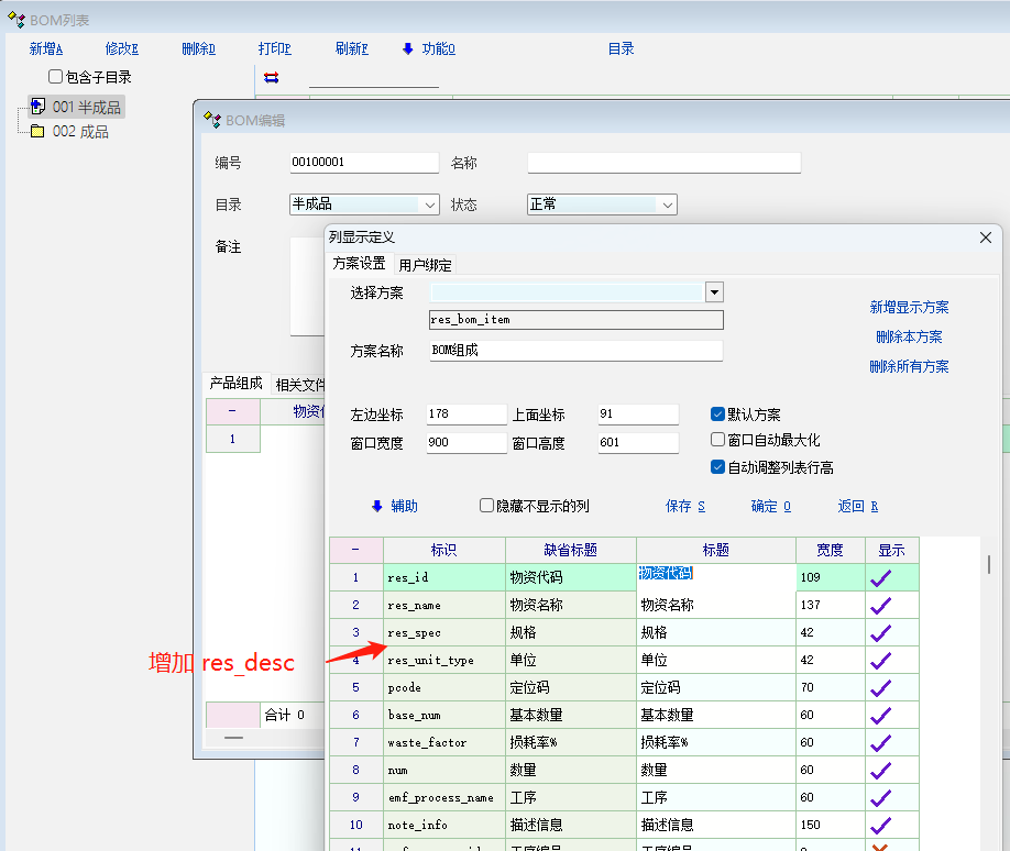 »bom定义 列显示方案增加 res_desc