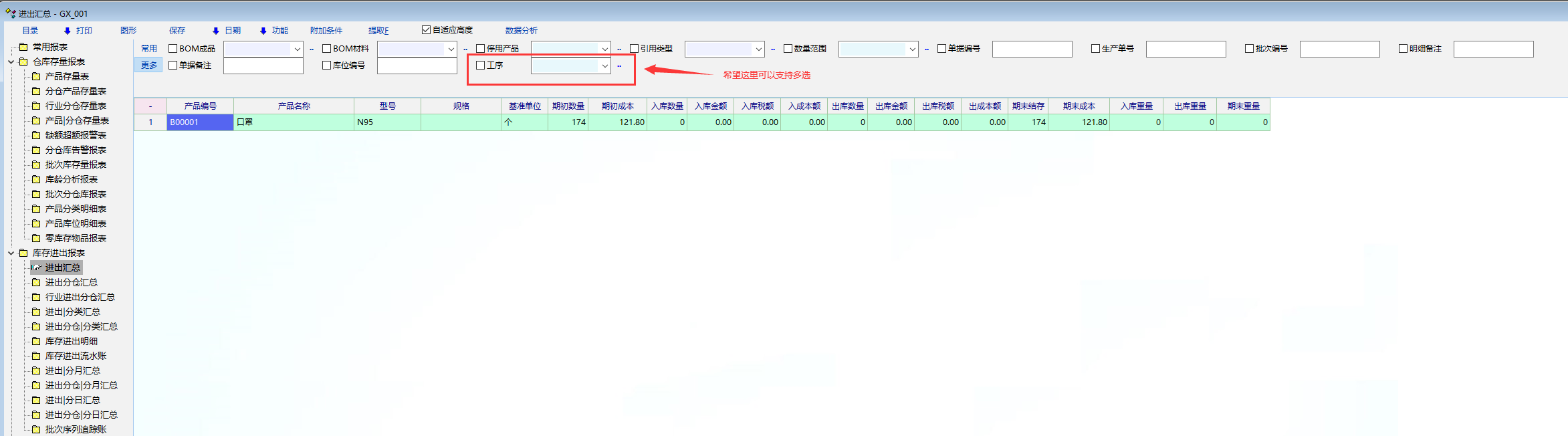 库存报表中“工序”检索项目前不支持多选,在生产报表中是支持的,希望在库存报表中该检索项也支持多选,以方便查询。