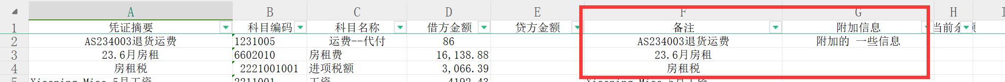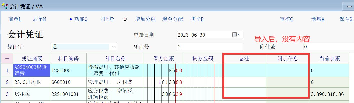 现在使用凭证导入功能,备注和附加信息栏位这2列内容是没有导入的。希望后续优化。