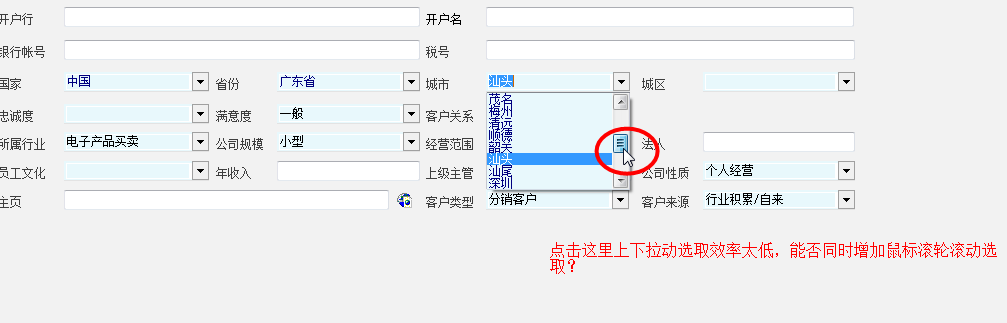 客户管理中,选择下拉框列表项现在只能单击右侧边框条上下拉动选取,效率好低。可否支持鼠标滚轮滚动选取。