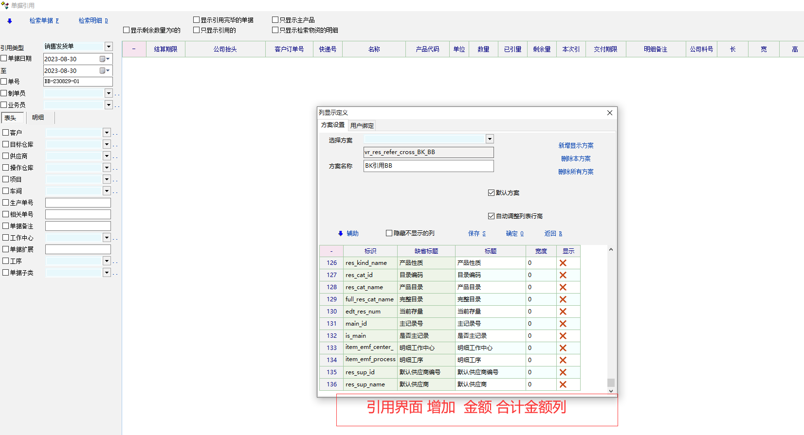 单据引用界面希望增加金额合计列
