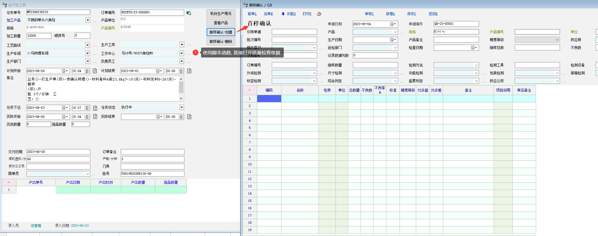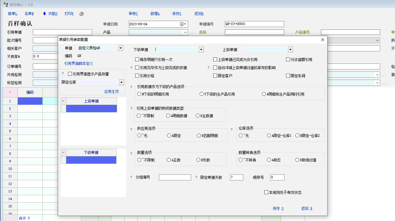 业务场景: 客户要启用一个生产首样确认的检查, 和默认的质量检查不一个单据. 启用了一个质量检查单据, 并没有配置引用流程, 但是按F6出现的是和质量检查一样的设置. 建议: 1. 引用流程单据定义 2. 启用的质量单据的扩展属性 和 自定义属性, 和默认的质量检查单据也共用了. 3. 添加脚本函数方法, 直接创建/打开质量检查单据 vr_create('QB'), 不好使.看效果图 详细看图. |