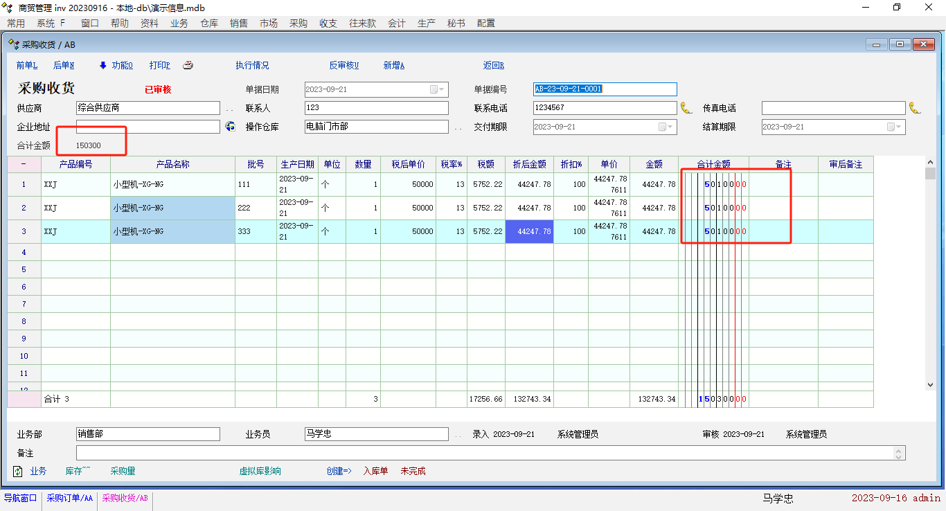 2、到货之后,做采购收货,3台电脑有三个批号,需要录入三行
