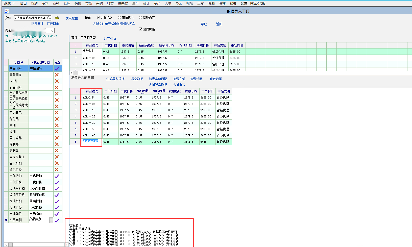 现状描述:同样的商品编号及相关信息,先进行导入到oit系统后,再进行自由式导入产品附加属性-多列模式方式进行导入时,系统出现记录 5 (res_id)该字典-产品编号值 ADR-30 必须预先定义,数据将不允许更新!!!详细看图片。