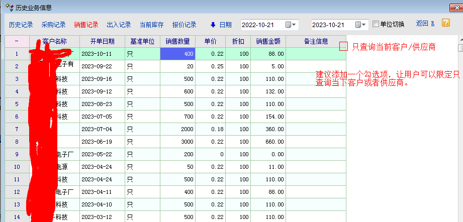 在物资单据中通过快捷键查询历史价格时默认显示所有客户(供应商)的价格的,建议添加个勾选项,可以让用户可以决定查询是当前客户(供应商)的历史价格还是所有客户(供应商)的记录。一般情景下给当前客户(供应商)开单,我们只需要查询、关注当前客户(供应商)的记录,这样子效率会高很多。