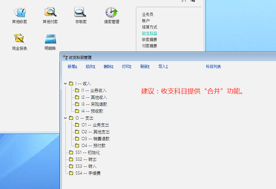 因企业因管理需要,中途会改变收支分类,建议《收支科目》提供“科目合并”功能。