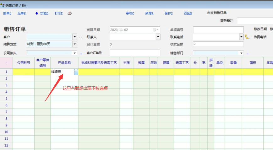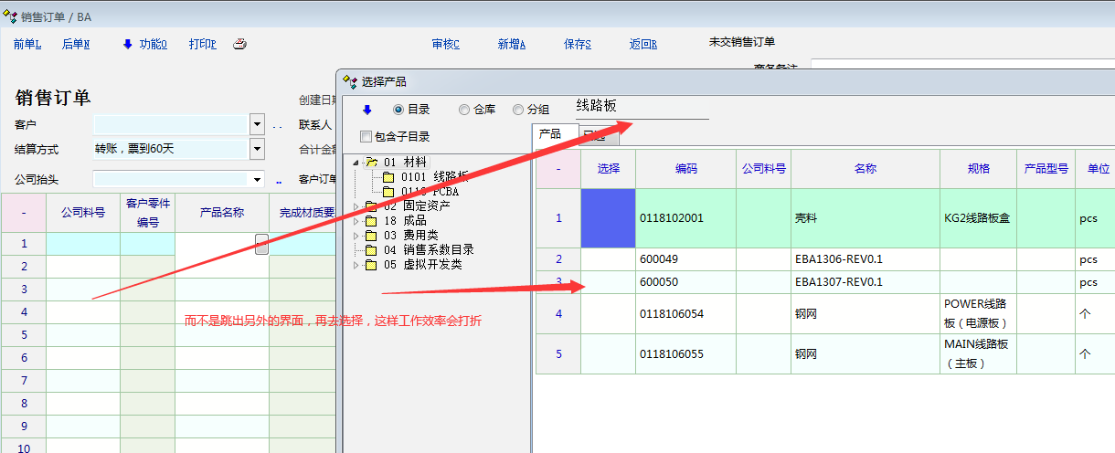 输入产品资料后,最好下面有出现相关的产品资料,直接可以选择。而不是又跳转到另一个界面去选择