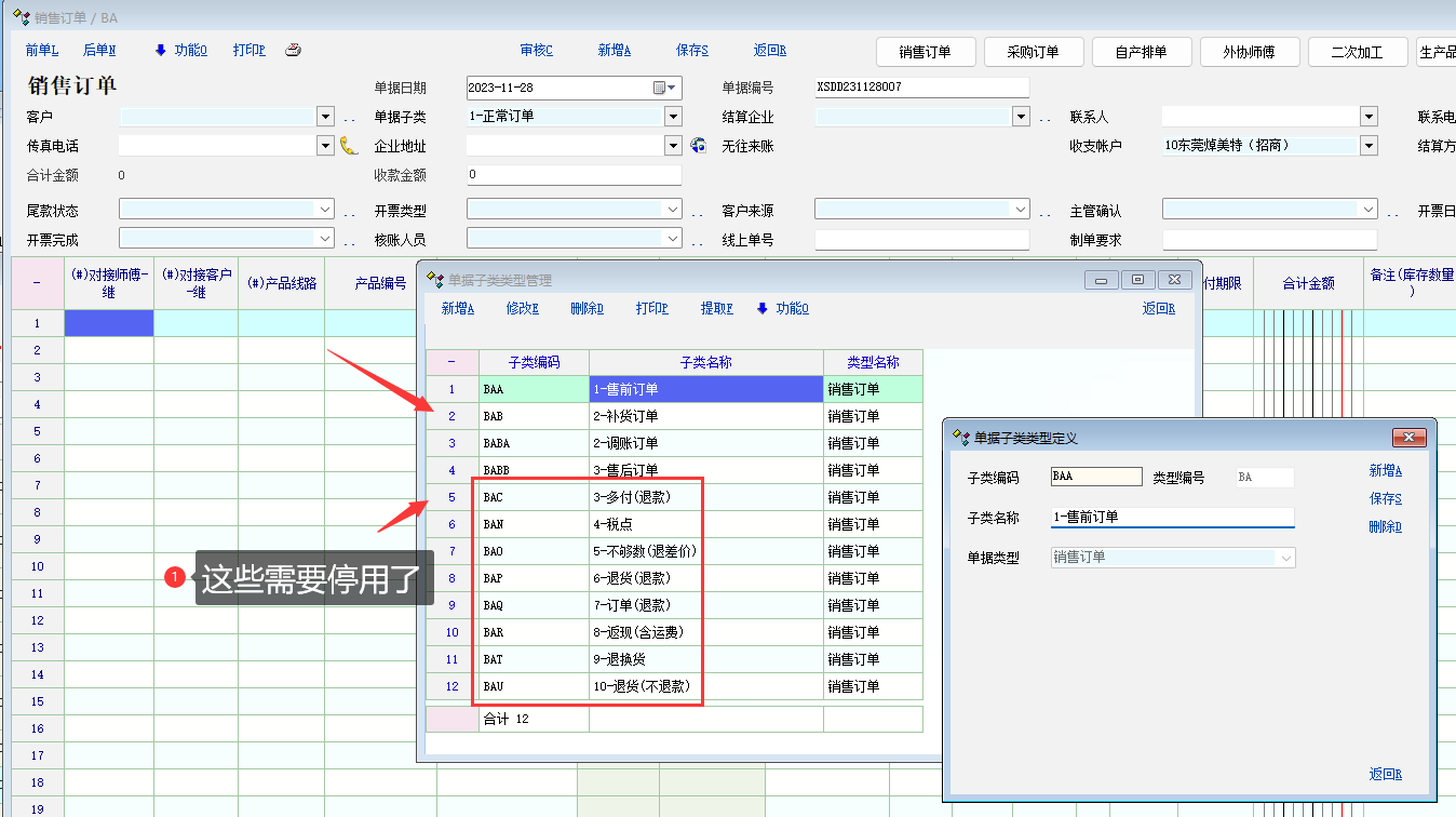 之前客户添加了多个单据子类型,并实际已使用了。